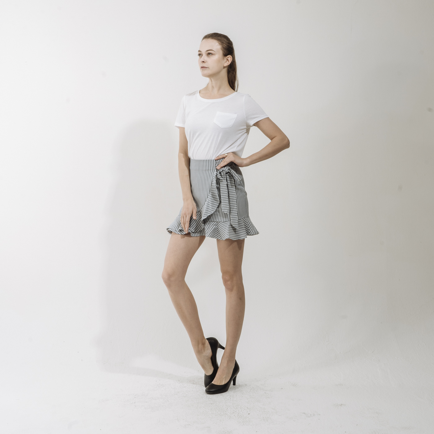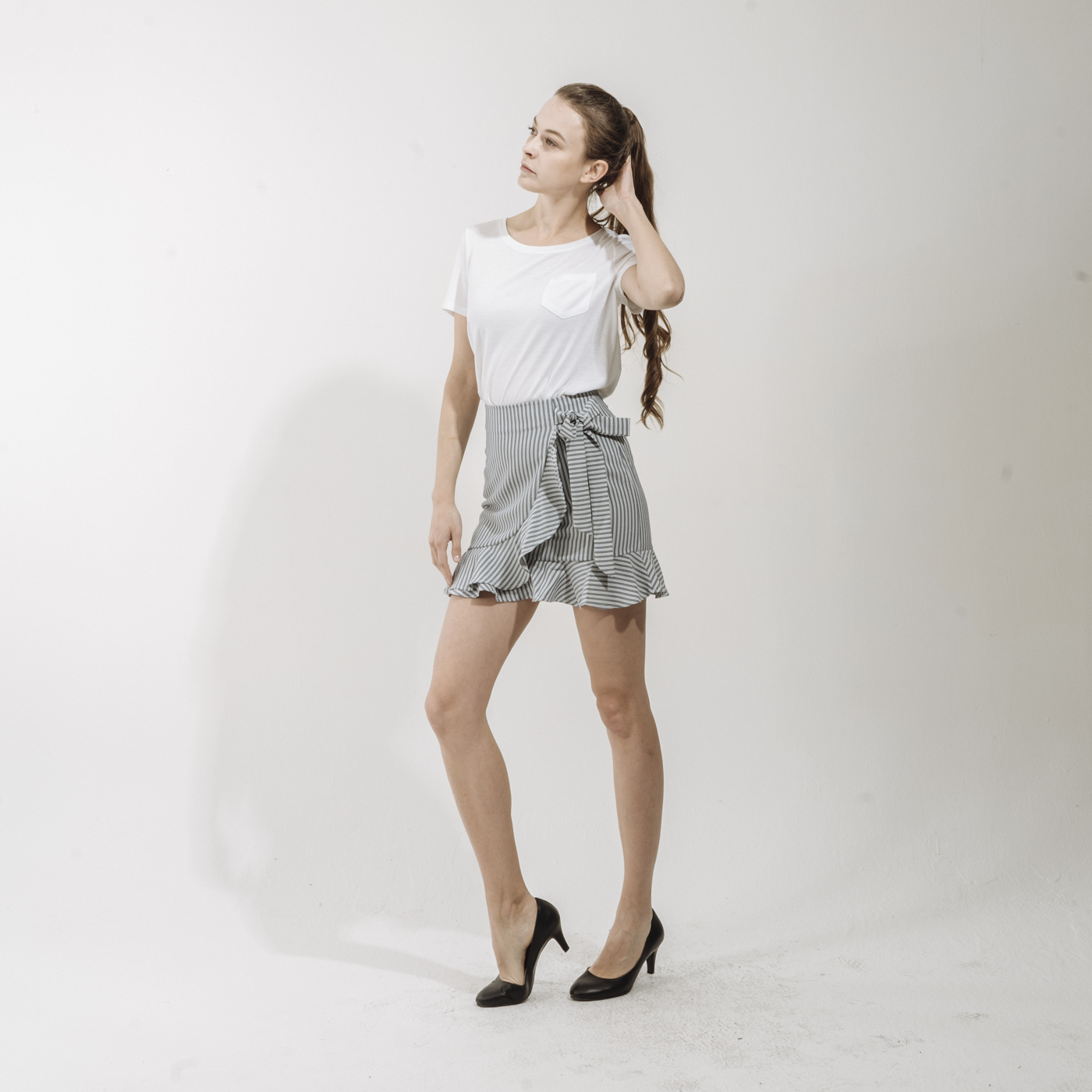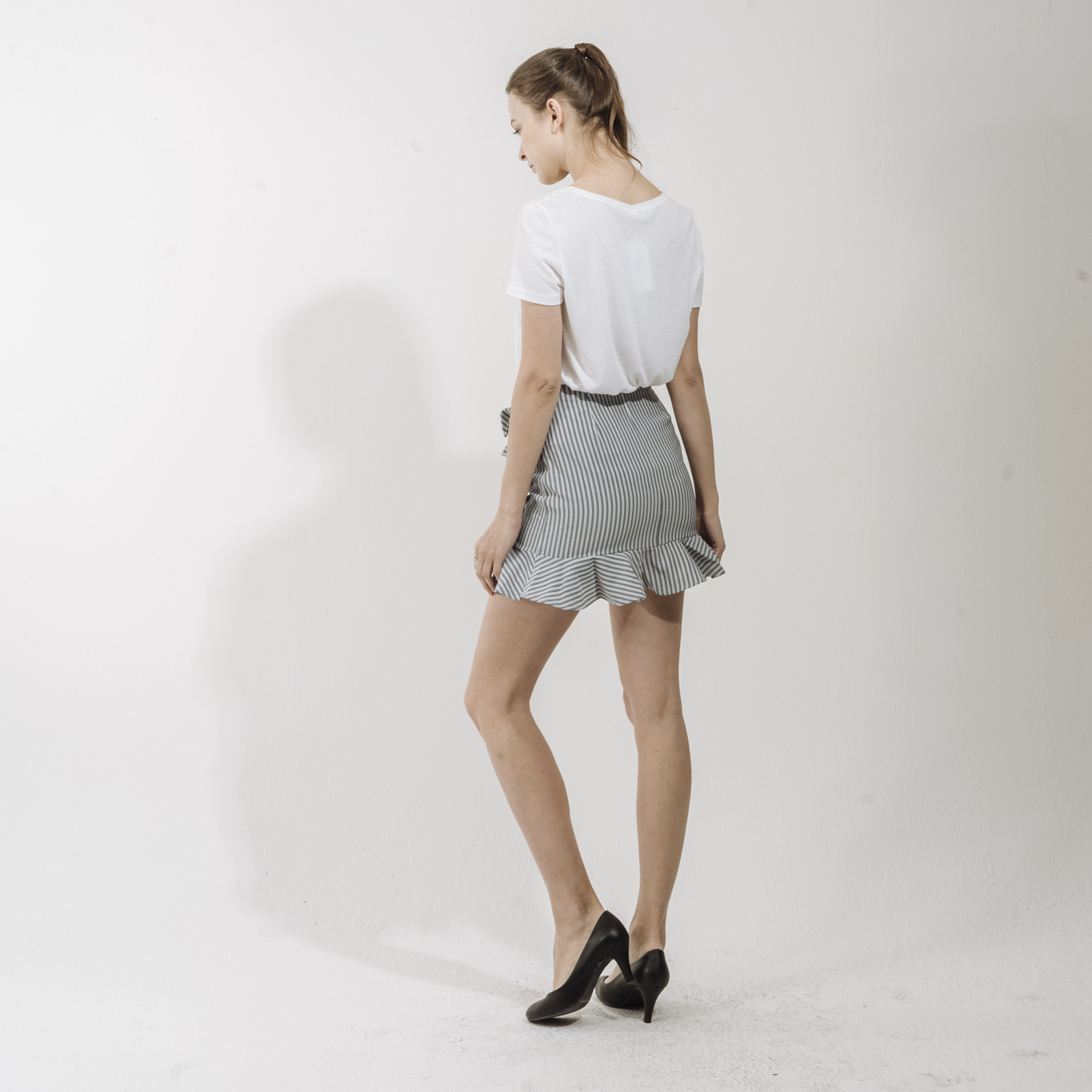 시원해보이는 패턴이 슬림해 보이며 프릴과 리본이 사랑스런 디자인입니다.