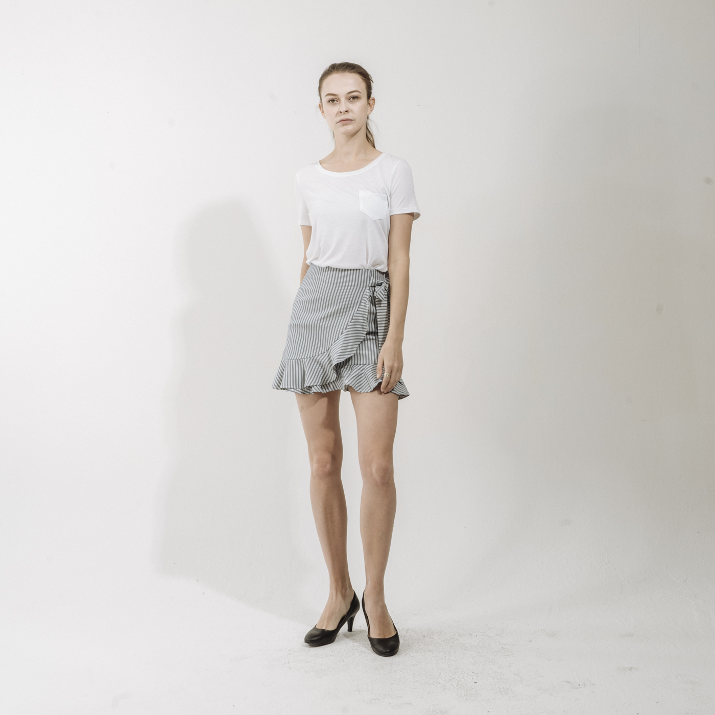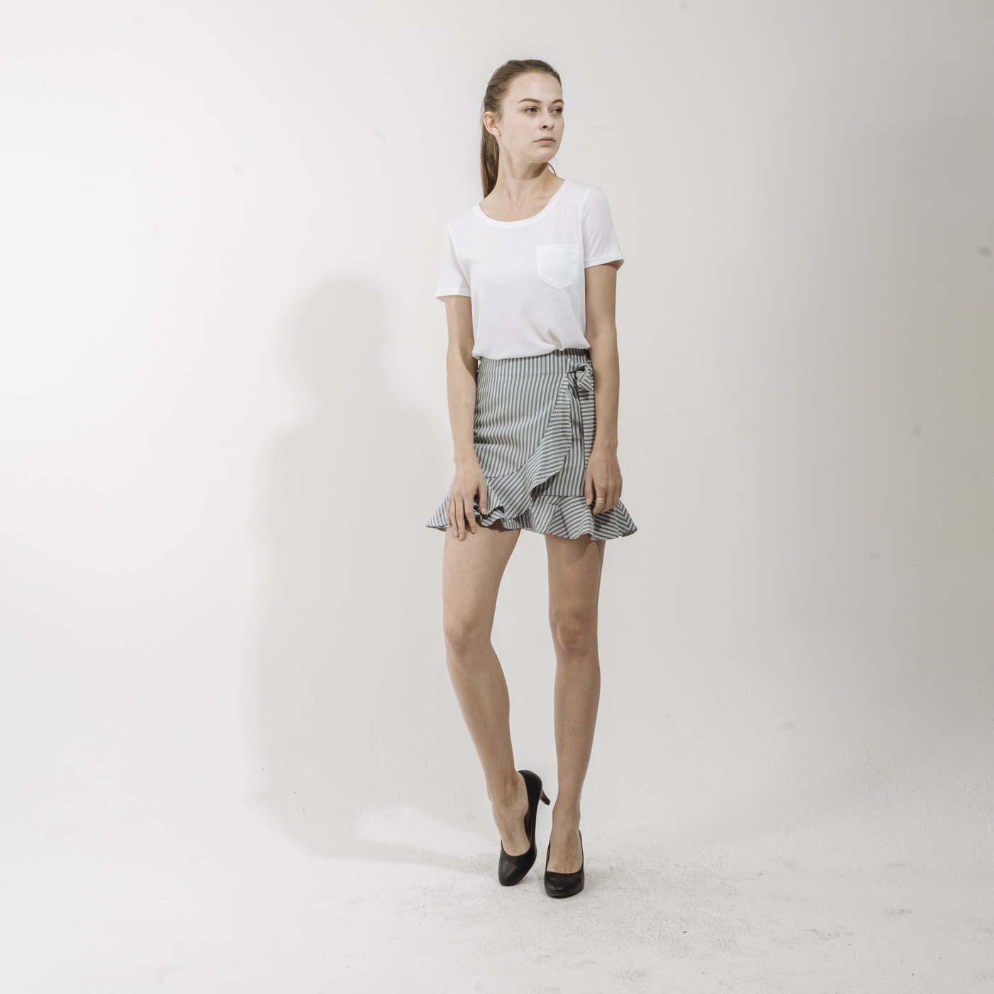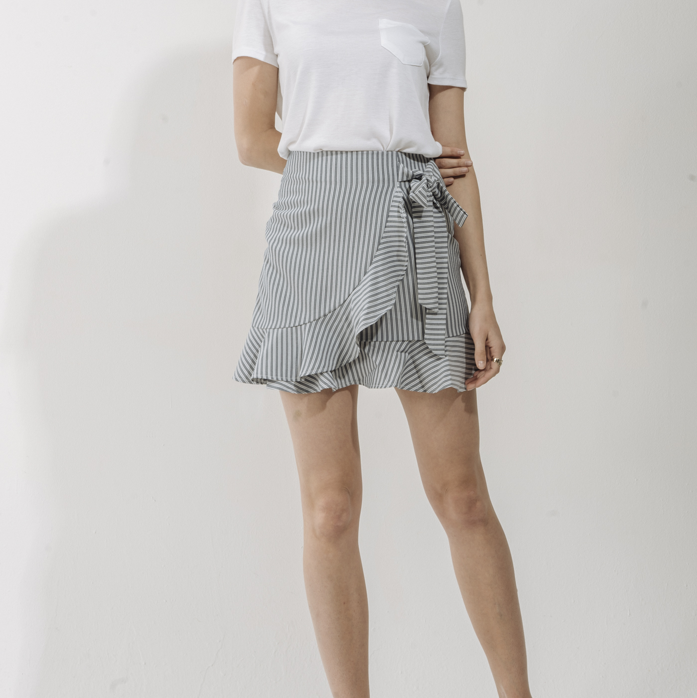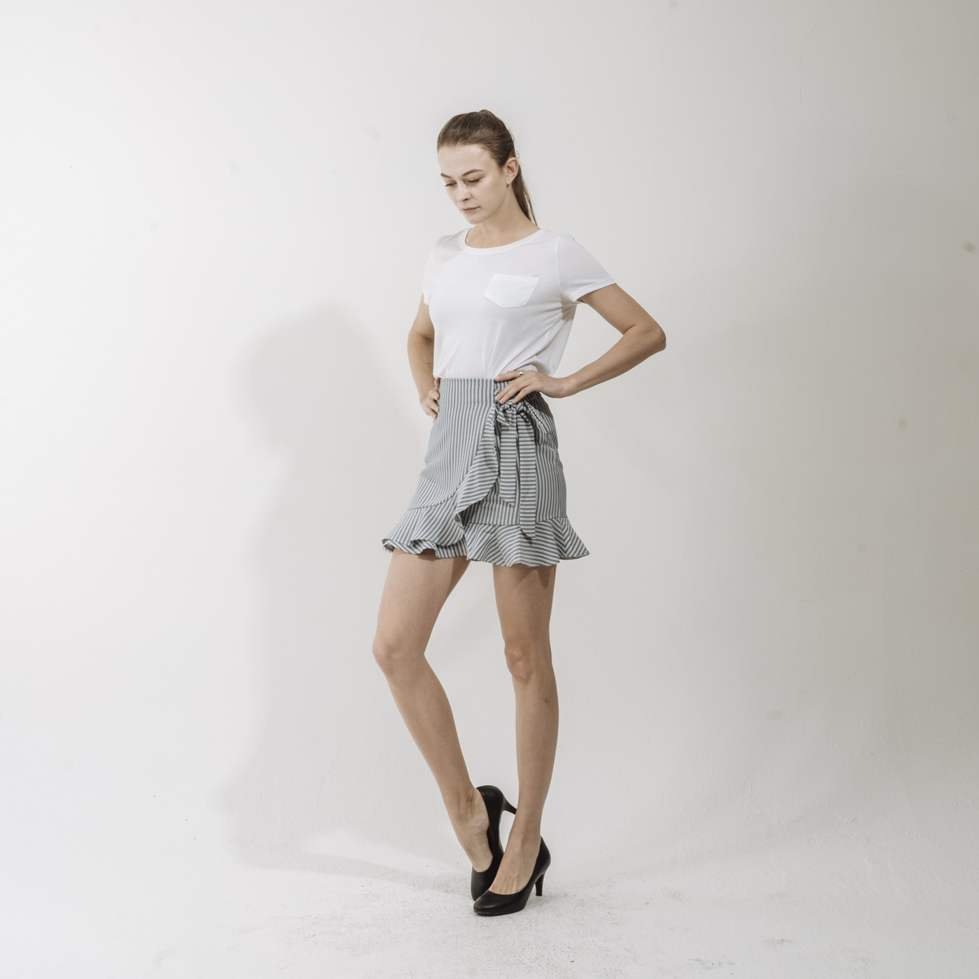시원해보이는 패턴이 슬림해 보이며 프릴과 리본이 사랑스런 디자인입니다.