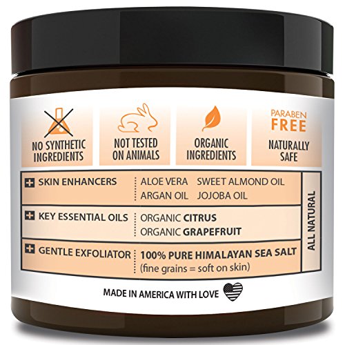 SPA QUALITY / ALL NATURAL INGREDIENTS Carefully hand blended with organic essential oils, skin smoothing enhancers and the undeniable exfoliating power of pure, fine grain Pink Himalayan Sea Salt. NOTHING ARTIFICIAL: NO chemicals, NO GMOs, NO Gluten, NO preservatives, NO perfumes, NO fragrances, NO parabens, NO alcohol, NO dyes, NO animal fats, NO petroleum - NONE of the bad stuff!
