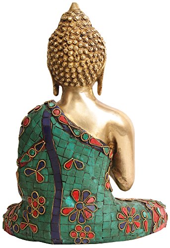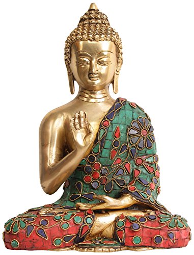 CraftVatika Large Brass Turquoise Abhaya Buddha Statue Tibetan Buddhism Blessing Idol Home Fengshui Sculpture