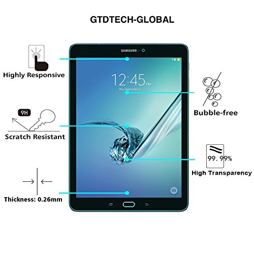 -. Feature : Specifically designed for Samsung Galaxy Tab S2 / 9.7 / Ultra-clear with 99.9% transparency to allow an optimal, natural viewing experience / Highly durable, and scratch resistant - surface hardness 9H / .33mm thickness is reliable and resiliant, and promises full compatibility with touchscreen sensitivity / Includes: 1x Glass Screen Protector, Micro-Fiber Cleaning Cloth, Squeeze Card