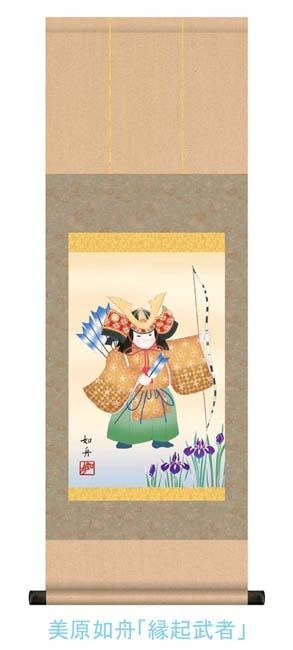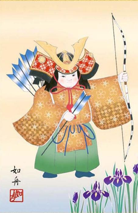 男の子の誕生と健やかな成長を祝い、将来の出世と無病息災を願う端午の節句の掛け軸です。愛らしい男児が大きな夢を抱き弓を射る姿に凛々しく逞しい成長を祈る、端午の節句に最適な逸品です。 |