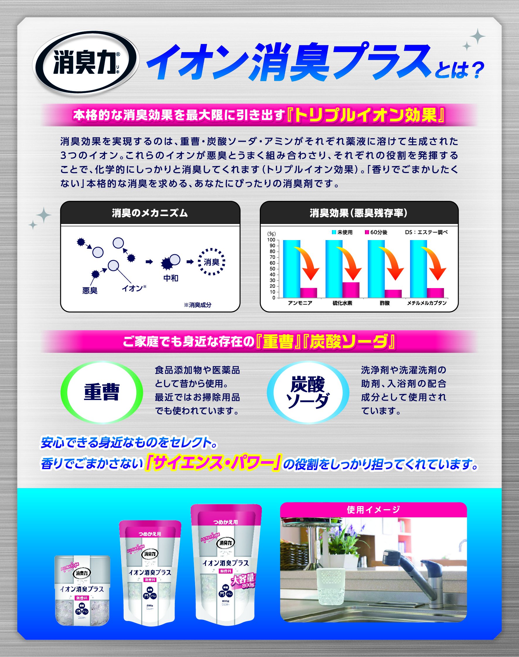 ● Chemical deodorization by triple ion effect generated from baking soda, carbonic acid soda, amine each, firmly deodorizes obnoxious odor.