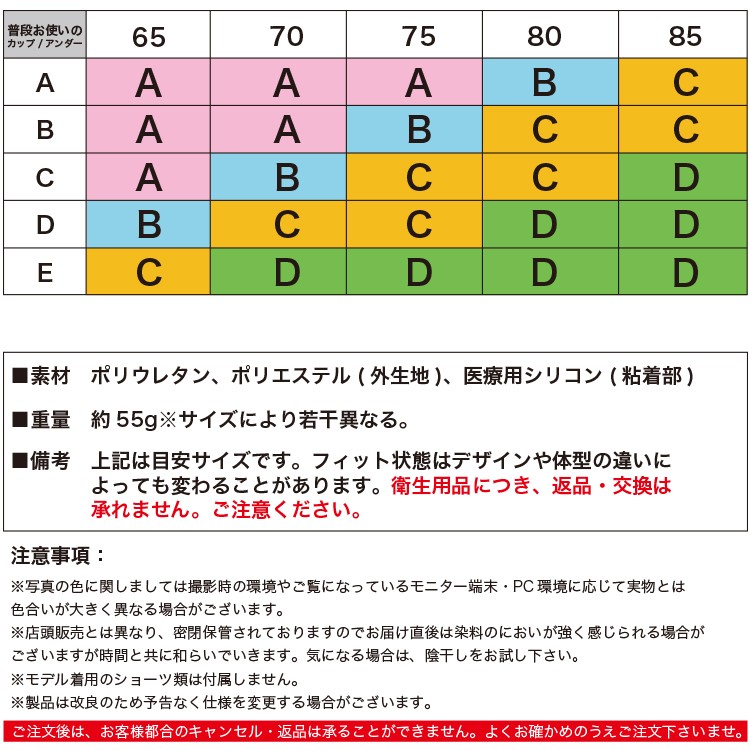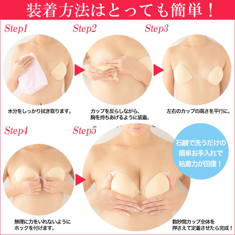 史上最厚(*)3cmのカップを採用した激盛りストラップレスヌードブラ。簡単装着で夢の3カップアップ!フロントホックで谷間をつくって、パッドなしで簡単に盛れちゃいます。ストラップがないからパーティードレスや水着にもピッタリ。小胸の悩みもあっという間に解消しちゃいます。粘着部は安心の医療用シリコンを採用。バストトップには粘着箇所がなく、総シリコン製の従来品と違ってウレタン素材だから軽量で通気性がよく付け心地も最高◎お手入れもを石鹸で洗うだけととっても簡単です!*当店比