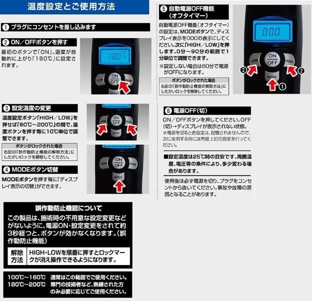 | 仕様 | パイプ径:25mm 電源:100V 50/60Hz(240Vまで可能) 消費電力:65W 設定可能温度:60度~200度 電源コード長:3m 温度制御:IC制御方式 |