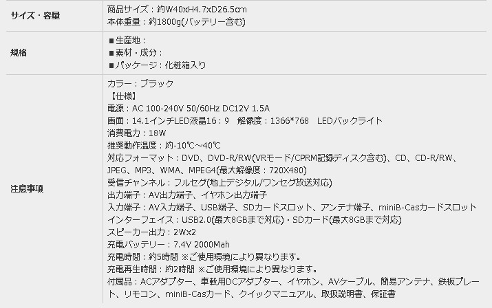 ●付属品:ACアダプター、車載用DCアダプター、イヤホン、AVケーブル、簡易アンテナ、鉄板プレート、リモコン、miniB-Casカード、クイックマニュアル、取扱説明書、保証書