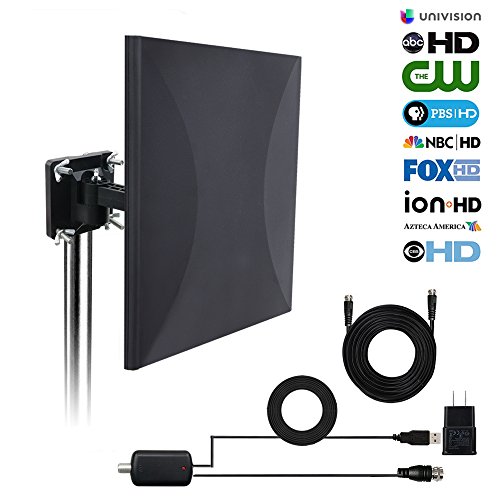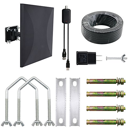Package Includes: 1 x HDTV Antenna 1 x Base 1 x External Amplifier 1 x Power Adapter 1 x 32.8ft coaxial cable 1 x M5 screw 4 x M6 screw 1 x M5*50 screw 2 x Iron clip 4 x Expansion nail 1 x User manual 0