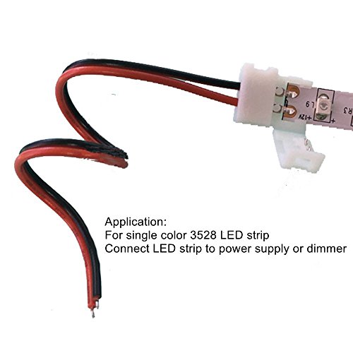 Solderless 2 contact flexible LED strip connector with pigtail, 8mm wide, clamp connection, used for connecting single color 3528 or 2835 flexible light strips and strip segments to dimmer or power supply. Make the connection easy and quick without soldering, save much more time especially when you make large led strip project.