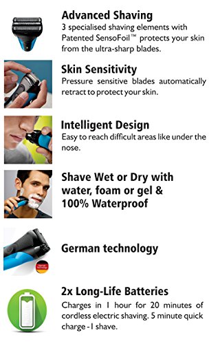 The Braun Series 3 rechargeable electric foil shaver is tough on beards and smooth on skin. The 3-pressure sensitive shaving elements adapt perfectly to every facial contour and shave in intuitive straight lines. Designed and engineered in Germany, the Braun Series 3 razor is built to last.