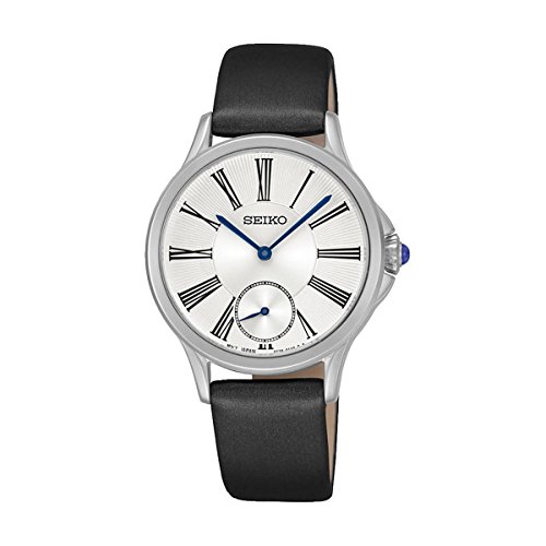 The Seiko women's watch. Classy design for today. This Seiko women's watch is ideal for a classic dairy use. The watch has a black leather strap, a white dial with black roman numerals indices and blue needles. Stainless steel case in silver-tone. Diameter of 32mm. Stay classy with Seiko!