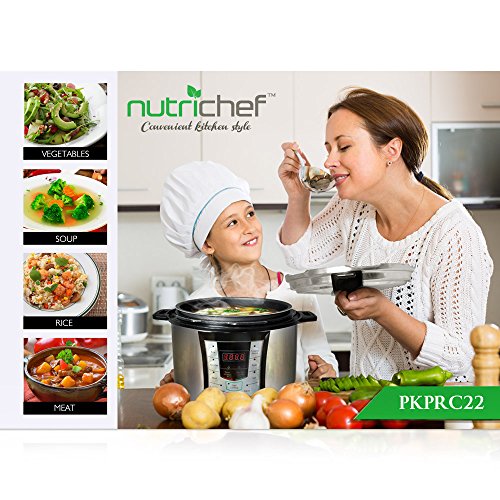 The NutriChef Digital Pressure Cooker & Slow Cooker provides you with convenient food prep ability. Cook smarter and prepare foods up to 70% quicker than using traditional cooking methods. Cook, bake, boil or braise foods faster than ever! The enclosed pressure cooking system and slow-cooking ability combine with a high-powered heating element that help keep a constant and consistent cooking temperature. Your food will keep all of their natural flavors and juices -- as well as retaining beneficial nutritional values. The integrated pressure safety valve and lock-top lid ensure thorough cooking, all while being time & energy efficient. Use the digital LCD display panel, with time & temperature controls, to create meals the whole family will enjoy! The non-stick teflon coated cooking pot is removable for easy serving and cleaning. Enjoy convenient kitchen style with the NutriChef Digital Pressure Cooker & Slow Cooker.