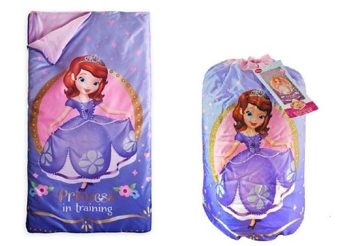-. Brand : Disney -. Feature : Size 15." x 10" x 10" / Open Up Dimensions: 52" x 30" x 3" / 100% Polyester for Shell, Lining, Padding -. Label : Disney -. Manufacturer : Disney -. PackageQuantity : 1 -. ProductGroup : Sports -. ProductTypeName : OUTDOOR_RECREATION_PRODUCT -. Publisher : Disney -. Studio : Disney -. Title : Disney Sofia the First Indoor Slumber Sleeping Bag For Kids w/Carry Drawstring