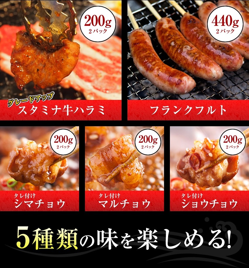 | 内容量 | 各200g×4種類×2セット(タレ漬け牛ハラミ+タレ漬けマルチョウ+タレ漬けショウチョウ+タレ漬けシマチョウ) 880g(フランクフルト) |