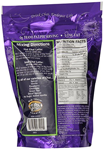 -. Binding : Grocery -. Brand : Big Train -. EAN : 0642628034045 -. Feature : Pack of three, 12-Ounce (Total of 36 ounces) / Creamy blend of vanilla, honey, green tea, and exotic spices with No Sugar added / Pre-mixed powder that makes a 10 servings of Chai Latte (per pouch) and requires no refrigeration / Simple to prepare - add a scoop of chai latte mix to hot or cold water, stir and enjoy / Big Train is based in Foothill Ranch California and distributes it's beverage mixes to coffee houses and retail outlets throughout the world -. Label : Big Train -. Manufacturer : Big Train -. Model : BT.540600 -. NumberOfItems : 3 -. PackageQuantity : 3 -. ProductGroup : Grocery -. ProductTypeName : GROCERY -. Publisher : Big Train -. Size : 12 Ounces -. Studio : Big Train -. Title : Big Train Green Tea Chai, 12-Ounce Bags (Pack of 3) -. UPC : 642628034045