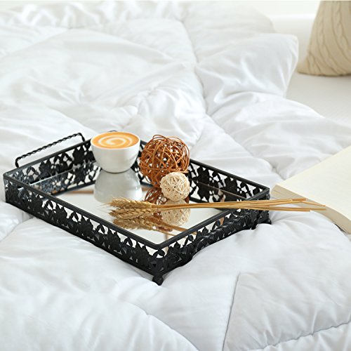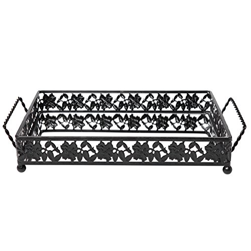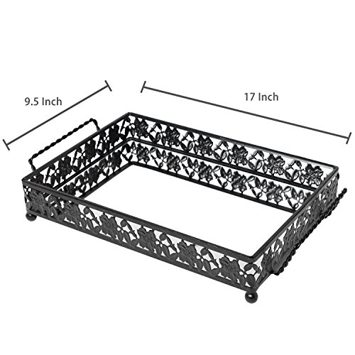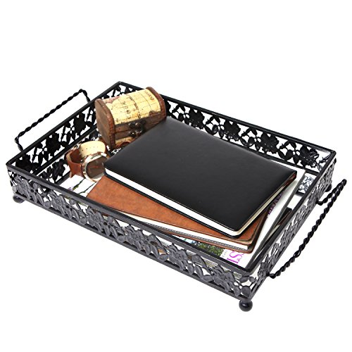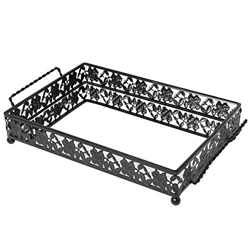 Vintage Floral Design Decorative Black Metal Serving Mirror Tray with 2 Twisted Handles