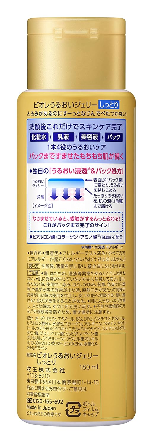 内容量:180ml 商品サイズ (幅×奥行×高さ) :49x40x167 「化粧水」「乳液」「美容液」「パック」を1つでかなえる、うるおいジェリー。毎日パックまですませたもちもち肌に。