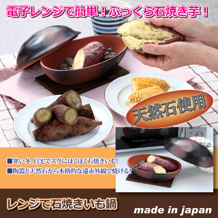 ●石焼きいも鍋の底に、添付の小石を薄く敷き、その上にさつまいも・じゃがいも・とうもろこしなどの食材をのせ、電子レンジ(500Wの場合)で約10分チンするだけ。