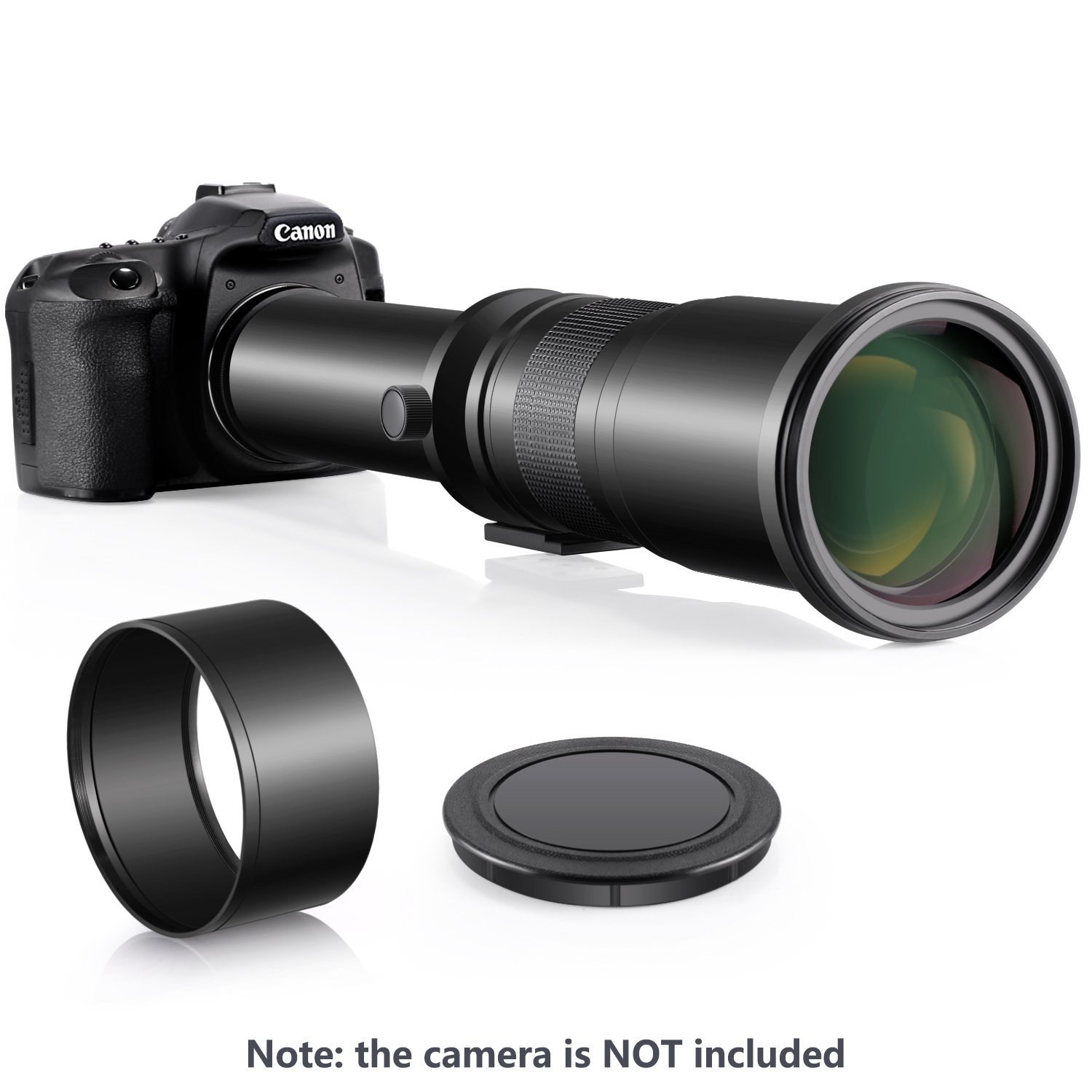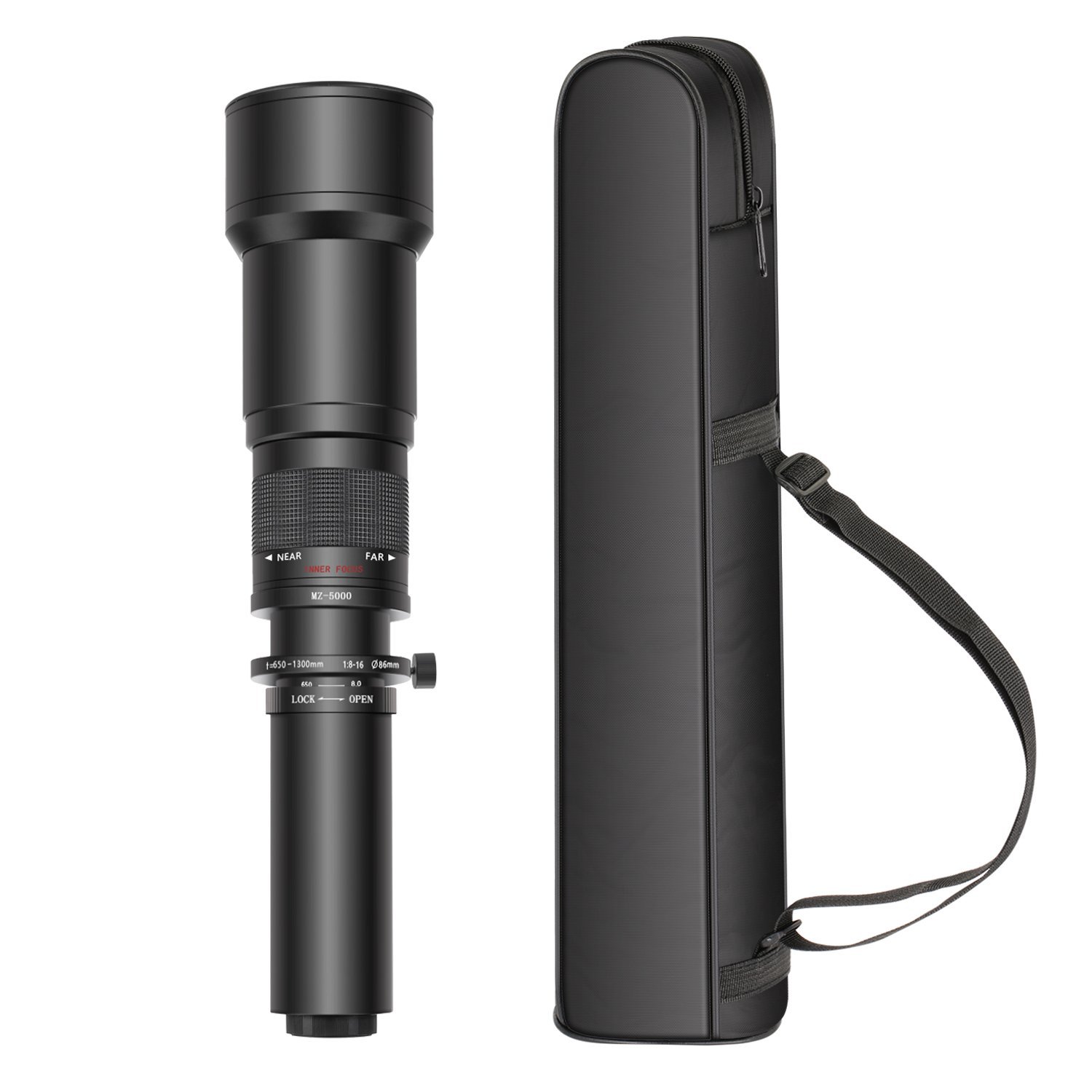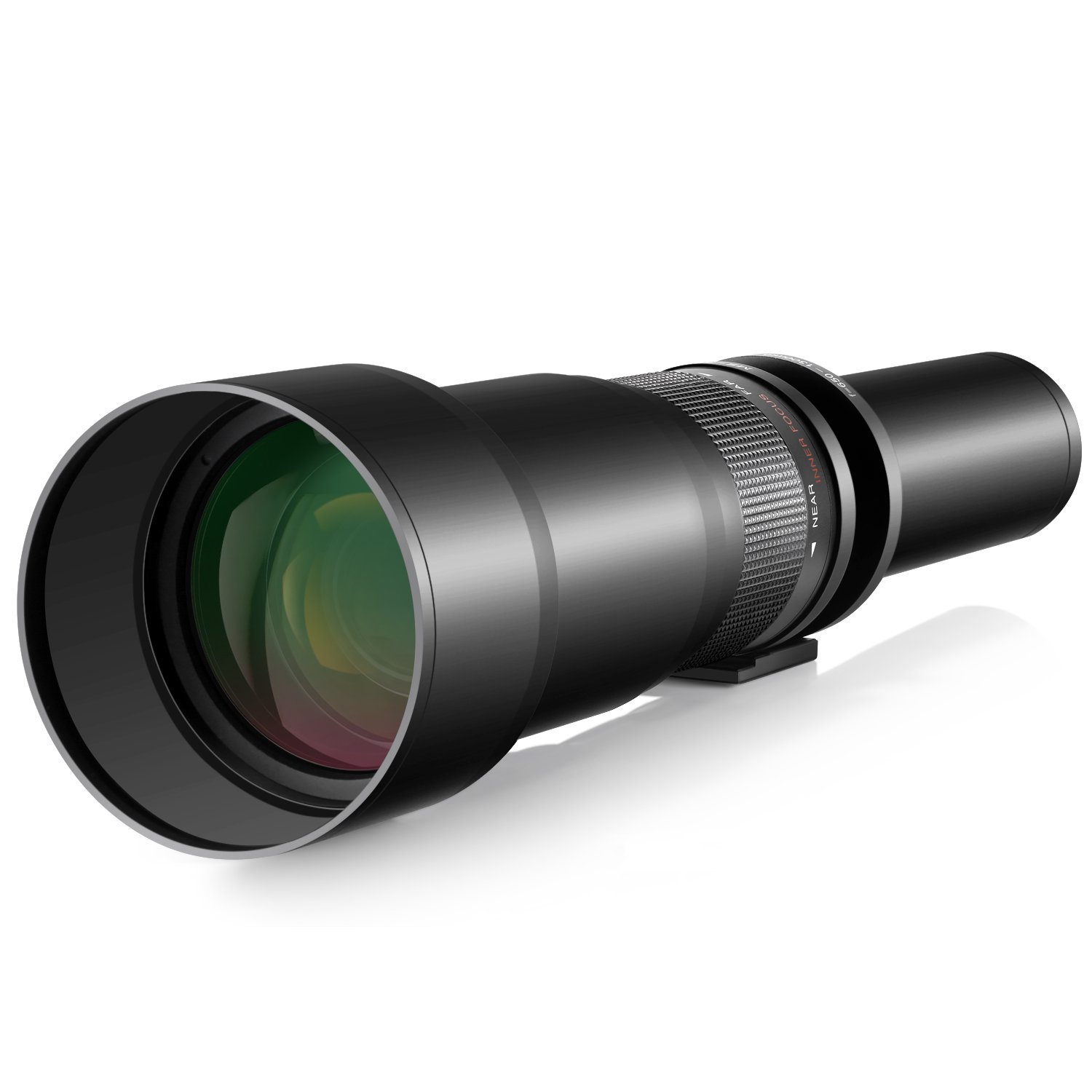 The -500 mm super telephoto lens has a wide range of zoom and attached tripod mount.