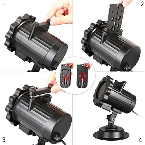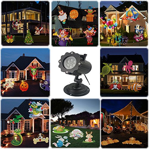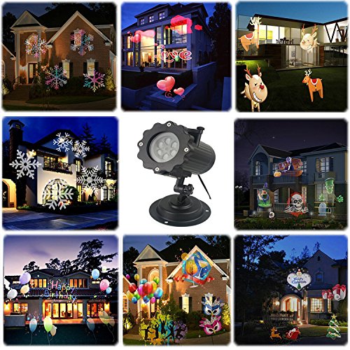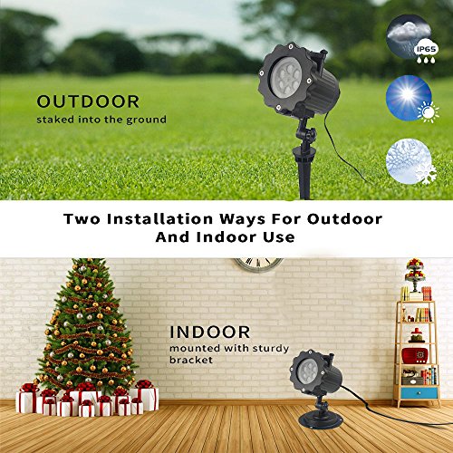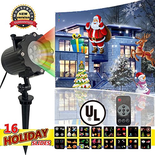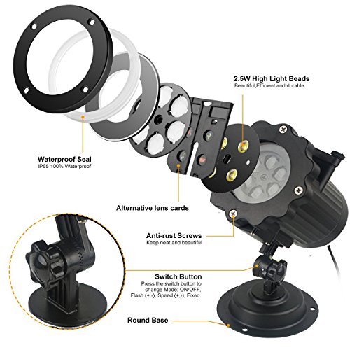 -. Feature : Upgraded Projector Lights: Takihoo christmas light projector is improved version with 16 slide show pattern: snowflake,rabbit, balloon, Santa, Christmas tree, pumpkin, ghost, skull, gift, Clown, animal, elk, fireworks, mask, heart shape etc / Holiday Decoration projector lights: waterproof IP65 projection lamp with 5M cable can be used indoor or outdoor for many festivals and occasions like: Halloween, Thanksgiving, Christmas, White Snowflakes, St. Patrick's Day , Easter Day, AP.R.Il Fool 's Day, Independence Day, Valentine's Day and Carnival and Life Series like Birthday Parties etc / More Brightness And Clarity: 16 interchangeable colorful projection images instead of black or white images. In a dark room, the pictures are very bright and clear, you also have the choices of speeding up or slowing down with the controller / Remote Control and Automatic Timer: With our wireless RF controller from up to 50ft away,you can change different modes such as dynamic, fixed, twinkle, and off, Energy efficient to save you money, automatic timer which built in daily 6-hour on, 18-hour off cycle, you can also choose to use the remote control to change 2H, 4H, 6H auto turns off / Safty & Guarantee: Waterproof led light show projector; CE, ROHS, FCC approved. UL, GS, SAA, BS, PSE safety certificated. Guarantee service and reliable customer service within a 24 hour time support, 30 day back money guarantee - 12 month warranty