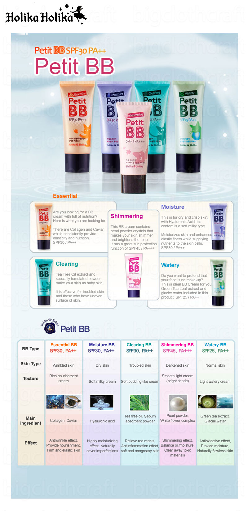 1. Clearing -renewaled to New Design Tea Tree Oil extract and specially formulated powder make your skin as baby skin. It is effective for troubled skin and those who have uneven surface of skin. SPF 30/ PA++ -Skin Type : Troubled skin Testure : Soft pudding-like cream Main ingredient : Tea tree oil, Sebum absorbent powder Effect : Relieve red marks, Antiinflammation effect, soft and nongreasy skin