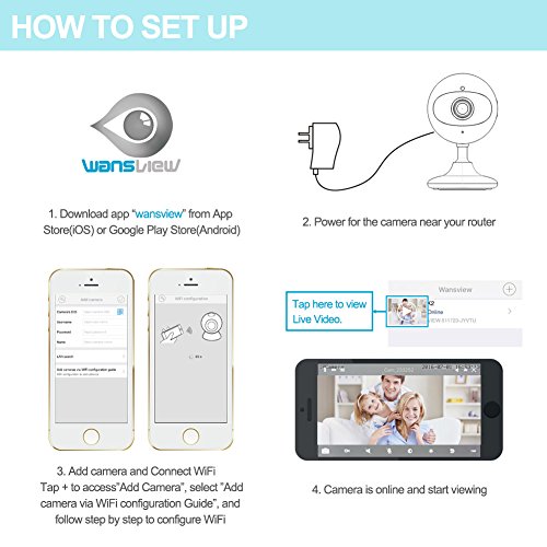 Quick setup with 2.4G WIFI : Using "Wi-Fi configuration Guide" via Wansview App so as to connect your Wi-Fi with camera, no complicated setting needed of this wireless surveillance camera.Important tips before connection:IP/Network-2.4GHz Wireless(Incompatible with 5GHz). If your router supports both band, please close the 5GHz wifi connection.