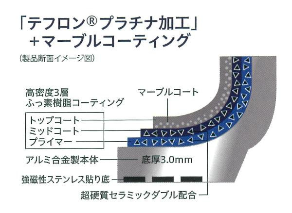 | 素材・材質 | 本体:アルミニウム合金 貼り底:ステンレス鋼 ハンドル:フェノール樹脂 表面加工/内面:テフロン(R)プラチナ加工・マーブル加工、外面:焼付塗装 |