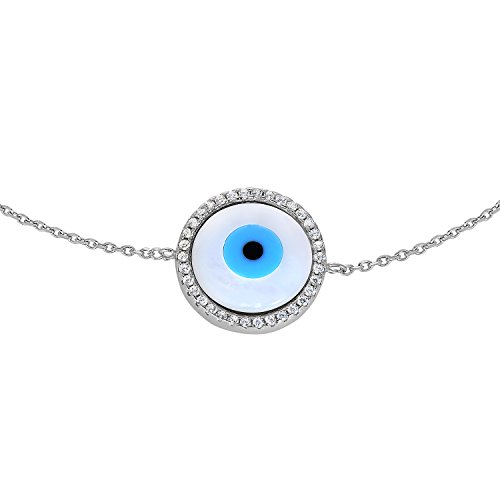 This Cubic Zirconia Evil Eye Mother Of Pearl Bracelet is stylish and classic. It is durable and strong due to its links' formation and strength. The Cubic Zirconia Stones are prong set to give an utmost light and spark to this magnificent bracelet. The Bracelet is 2 sided hence it offers versatility. The Evil Eye Cubic Zirconia Bracelet symbolizes life, spirituality and protection. The Eye protects us so that no Evil will befall upon us.Feature
