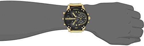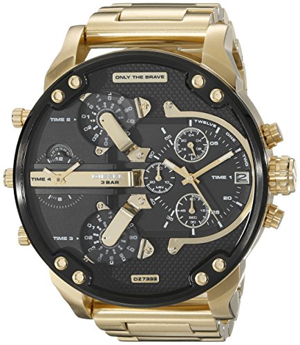 Gold-tone stainless steel watch with large textured-black dial featuring multiple chronograph functions and date display