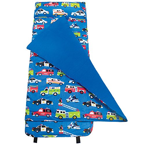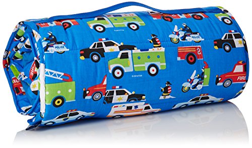 Includes matching and removable pillow. Recommended ages 3 and up. Handy carrying strap. Embroidery friendly. Naturally flame-resistant. Never treated with chemicals. Easy roll-up with fastening straps. Machine washable: gentle cycle and cold water. Conforms to U.S. flammability test requirements. Cotton/polyester exterior. Attached blanket lined with 100% cozy cotton flannel interior. 1-Year manufacturer's warranty against defects - normal wear-and-tear and misuse excluded. 50 in. L x 1.5 in. W x 20 in. H. Great for school, sports practice, sleepovers and more! ?The durable exterior makes these bags versatile, while the roomy interior makes getting packed and unpacked a cinch! Features a handy, detachable shoulder strap. A festival of heroic lights! This playful pattern pays tribute to our valiant fire, police and rescue men and women. An Olive Kids design, the Heroes pattern features utterly unique renditions of fire, police and emergency vehicles on a rich blue background.Feature