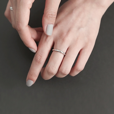 1. 정성스럽게 꼬아놓은 밴드의 형태로 내츄럴한 빈티지 느낌이 가미된 디자인입니다.2. 어느 제품보다, 실버 주얼리의 매력을 한껏 느낄 수 있는 링입니다.3. 다른 링들과도 자연스럽게 연출이 가능한 제품입니다.4. 같은 디자인의 #6 보다 조금 더 심플한 느낌의 링입니다.