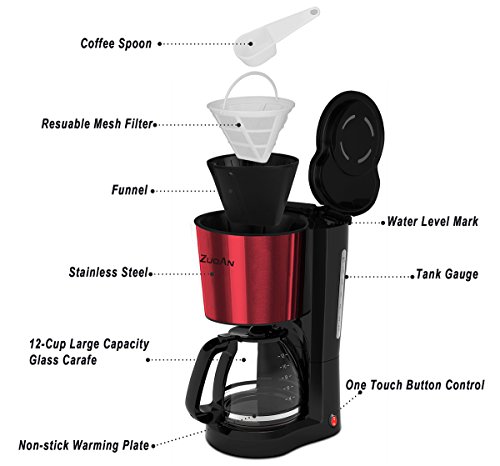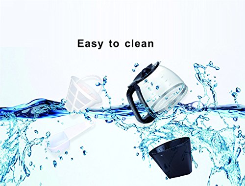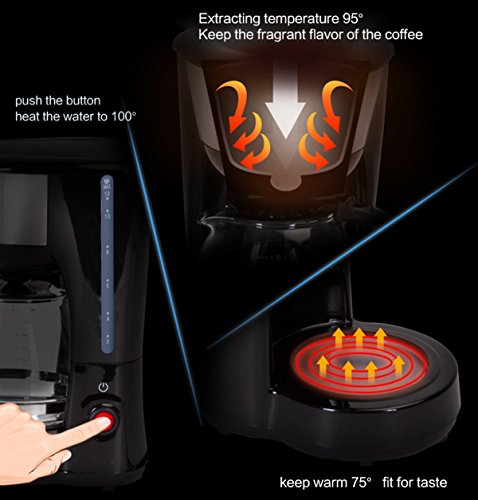 Classic functionality keeps brewing simple and easy. Making it easy to serve brewed coffee for your family or group. Customizable Brewing Options Drink your favorite coffee every morning using features like the brew strength selector and the option for small-batch (1-12 cup) brewing that maintains all the flavor of a full brew. Features • Maximum 1.5L / 12-Cup • Removable filter basket lifts out for fast and easy filling and cleaning • Brewing pause 'n serve lets you pour a cup of coffee while the coffeemaker is still brewing • Water window shows the amount of water in the reservoir for accurate filling • Stain-Resistant Warming Plate is easy to clean and prevents staining Easy To Use 1. Open the top lid and fill the water tank with drinking water. 2. Place the funnel into the funnel support, then put the filter correctly. 3. Add coffee powder into filter, then close the top lid. 4. Place the glass coffee pot on the keeping warm plate. 5. Press the power button, indicator light will turn on red, then appliance will begin working. Specification Rated Voltage: 120V, 60Hz Rated Power: 900W Dimensions: 8.86 inches(L)*7.87 inches(W)*13.98 inches(H) Package Included 1 X 12-Cup Drip Coffee Maker 1 X Glass Coffee Pot 1 X Reusable Mesh Filter 1 X User manual Warm tips Please just brew water to clean the water tank for the first use or for use after a long period of time. Please turn off the power button, if you wouldn't like to keep your coffee drinking anymore. Guarantee We are attention to detail, and committed to providing each customer with the highest standard of customer service. We provides Worry-free One-Year Warranty.Feature