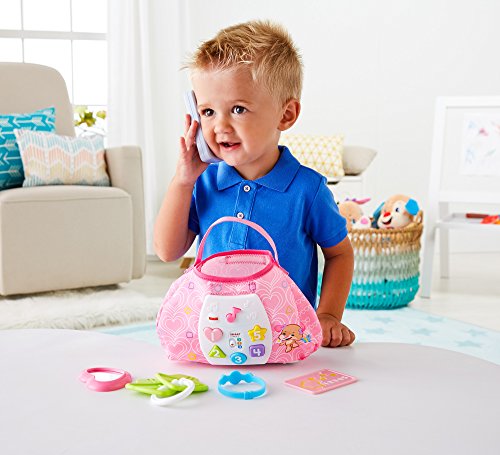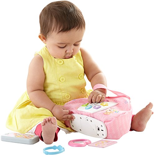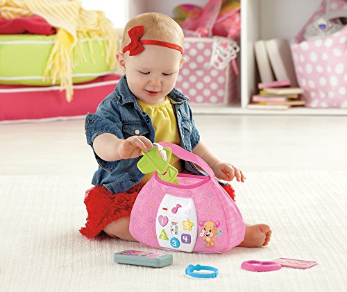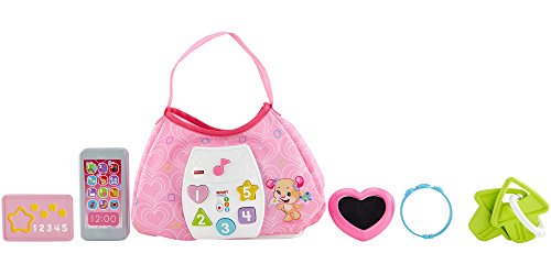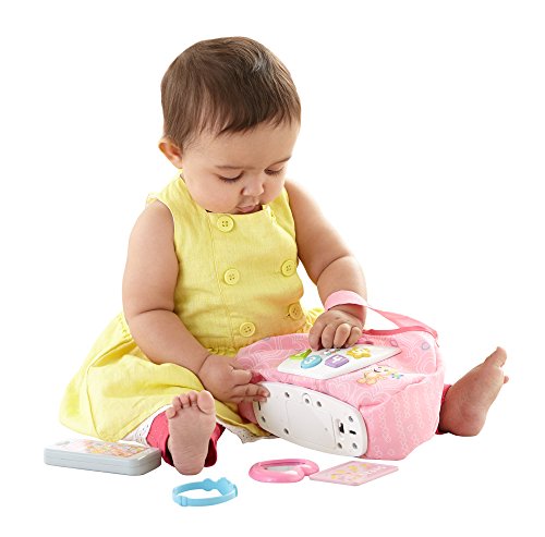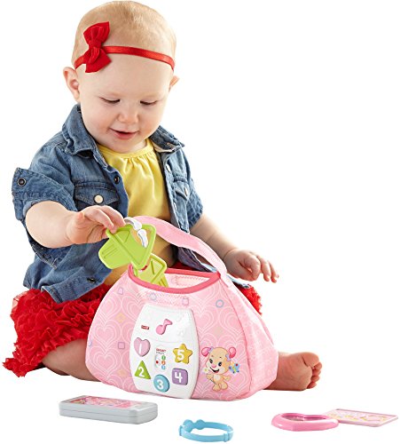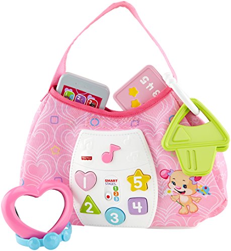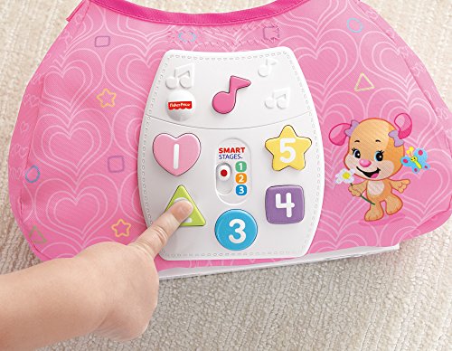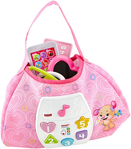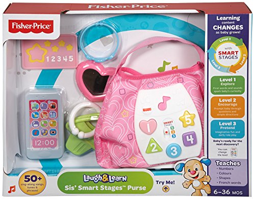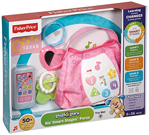 Baby's ready to go with Sis' Smart Stages Purse! This stylish soft pink purse is loaded with five play pieces and Smart Stages sing-along songs, words and phrases that teach all along the way! Press the shape buttons on the front to introduce baby to shapes, numbers and colors in English and Spanish. The rattle phone, heart mirror, bracelet, credit card and clacker keys help exercise baby's fine motor skills and foster early role play. All accessories fit inside, so baby can get "carried away" with the fun at home or on-the-go! Sis' Smart Stages Purse includes Smart Stages technology, an exciting new way to change learning content as baby grows. Every baby develops at his or her own pace, and Smart Stages technology gives you the ability to select the stage that's best for your child! There are a variety of developmentally appropriate songs, phrases and sounds within three levels of play - just slide the switch for level changes. Smart Stages Technology Level 1 - Explore - 6M+ First words and sounds spark baby's curiosity Level 2 - Encourage - 12M+ Prompt baby through questions and simple directions Level 3 - Pretend - 18M+ Imaginative fun and early role play.