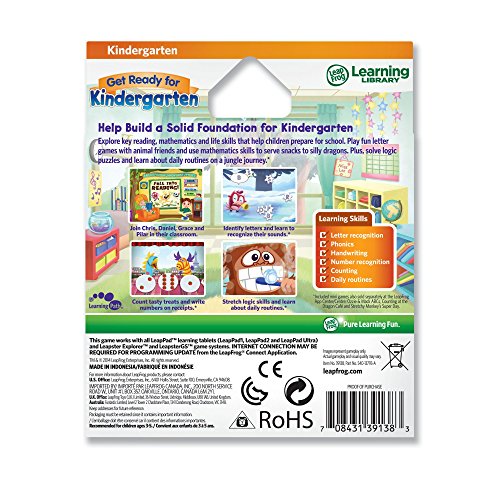-. Feature : The Get Ready for Kindergarten Game Pack teaches core skills to little learners and helps prepare them for school. This suite of three games provides a rich curricular experience in reading, math and life skills and lays a foundation for future success. For ages 3-5. / Join kindergartners in their interactive classroom and explore letters, numbers, routines and fun. Build literacy skills while playing fun letter recognition games. Works With: LeapPad Ultra, LeapPad1, LeapPad2, Leapster Explorer, LeapsterGS Explorer. / Practice writing letters-from simple to more complex-and get instant feedback and rewards. Recognize letter sounds to feed a hungry bug with a big appetite for the alphabet. Explore math and identify numbers at the Dragon Café by serving snacks to silly dragons. / Write numbers to prepare receipts, and level up by tracing curved lines and writing higher numbers. Get into the swing of daily routines by helping Stetchy make his bed, brush his teeth, get ready for work and more. Head to the jungle to solve logic puzzles and help Stretchy deliver bananas. / Children who enter kindergarten with key competencies may be better positioned for future academic success. Skills learned include counting, daily routines, handwriting, logic & reasoning, number recognition, and phonics.