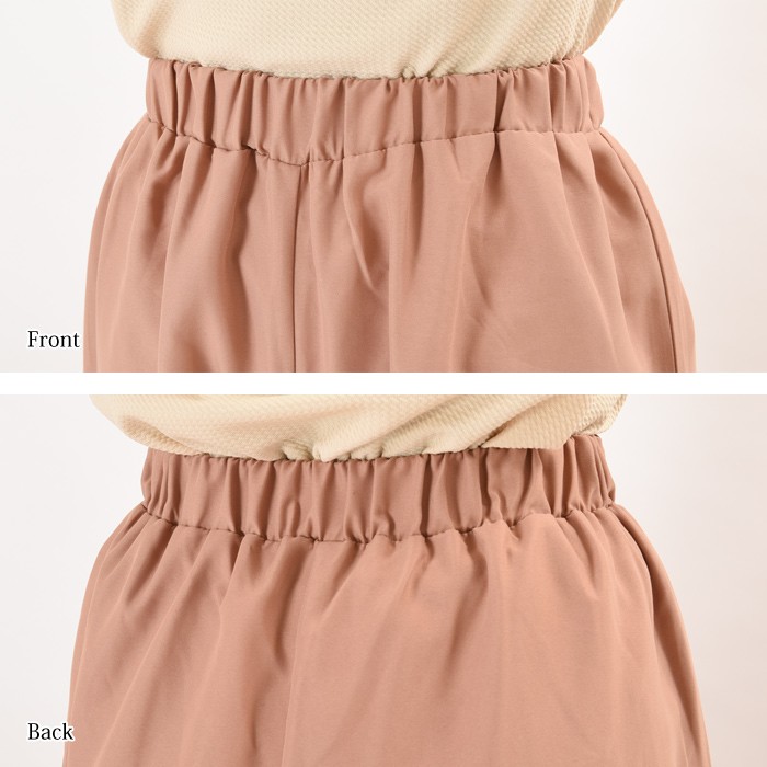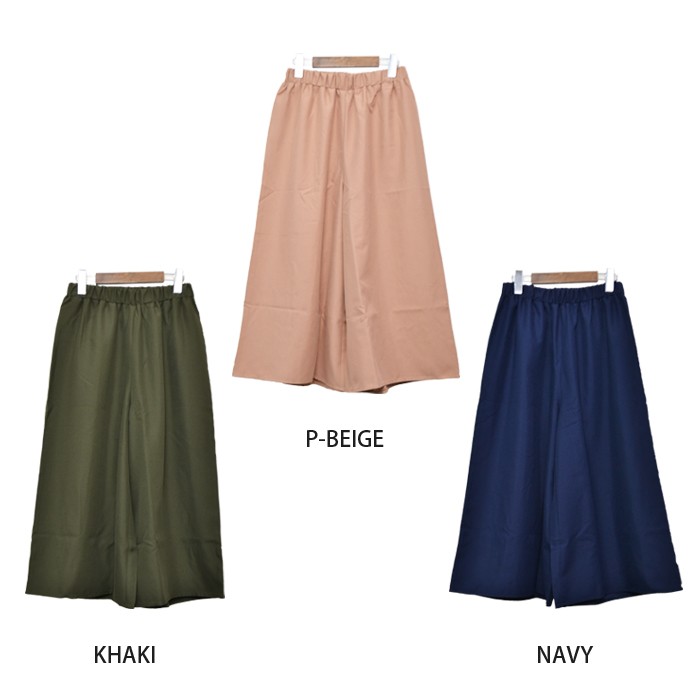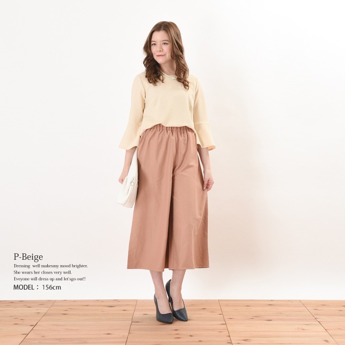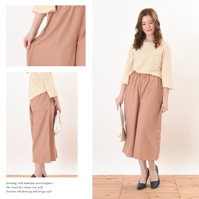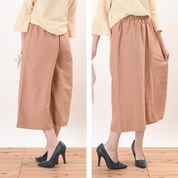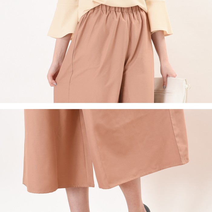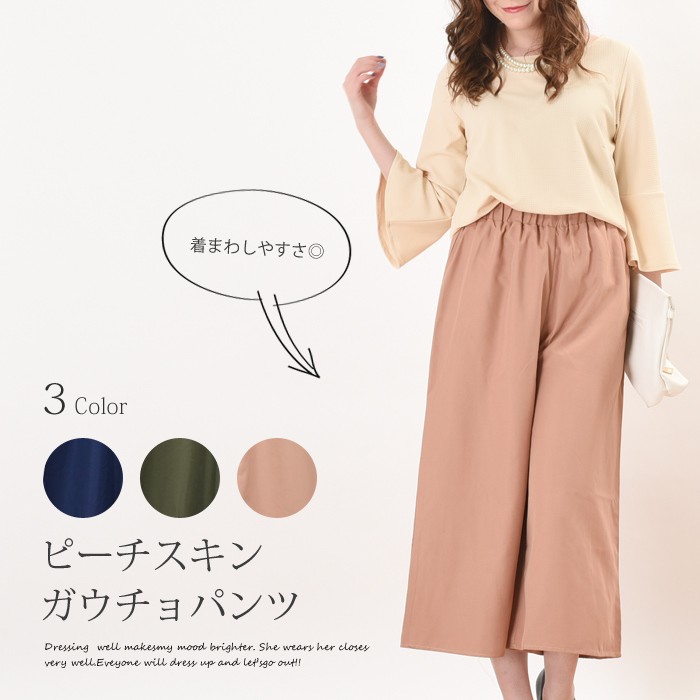 ややハリがあり、しっかりとした生地感のピーチスキン素材のガウチョパンツです。シンプルかつ上品で落ち着いた雰囲気で、無地でシンプルなデザインなので幅広いコーディネートに着回しがしやすいです。ハリのあるしっかりとした生地感なので上品な印象になり、普段使いからお出かけ着に幅広く着まわせるのでワードローブにお使いいただけます。ウエスト部分にはゴムが入っているので、ゆったりと着心地楽ちんです♪Mサイズ Lサイズ