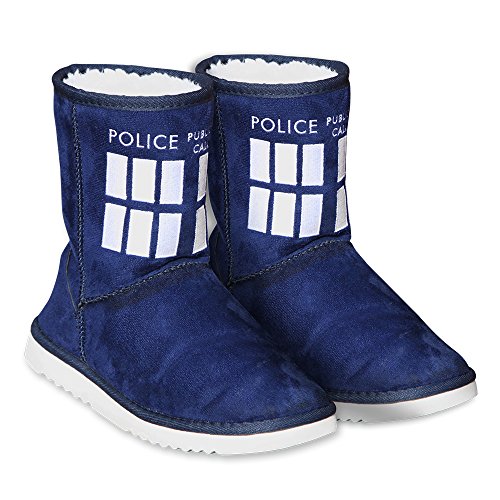 -. Binding : Apparel -. Brand : Doctor Who -. Color : Navy -. Department : womens -. Feature : Perfect for the ultimate Doctor Who fan! / Officially licensed slippers w/ embroidered TARDIS design / Plush interior & textured sole for wearing indoors or outdoors / Sizes tend to run a little small / Multiple sizes available -. Label : Doctor Who -. Manufacturer : Doctor Who -. Model : SH-234872-PARENT -. NumberOfItems : 1 -. ProductGroup : Shoes -. ProductTypeName : SHOES -. Publisher : Doctor Who -. Studio : Doctor Who -. Title : Doctor Who Women's TARDIS Boot Slippers