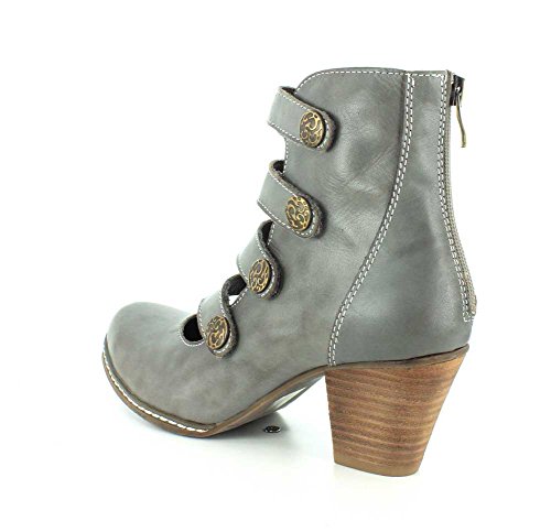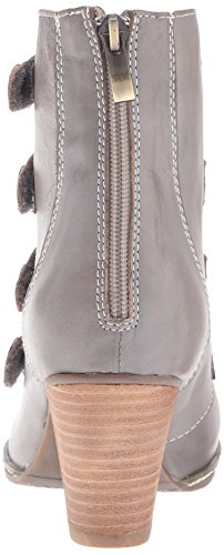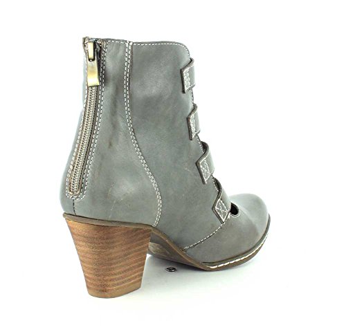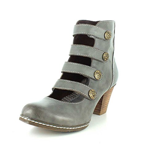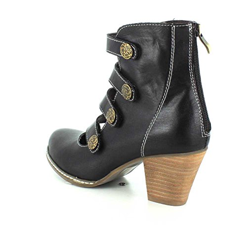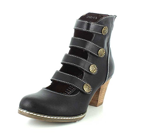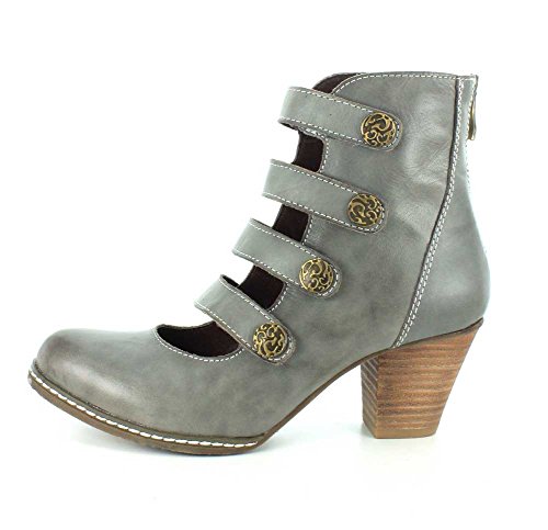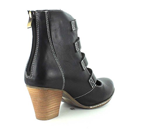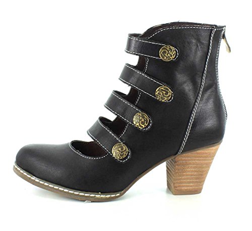 Product DescriptionHand painted leather multi-strap bootie with contrast stitch detail and ornate decorative buttons.0