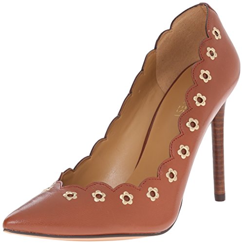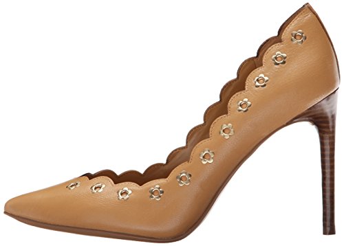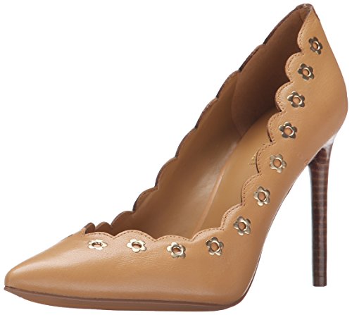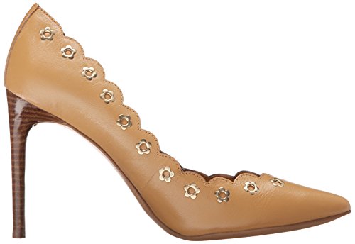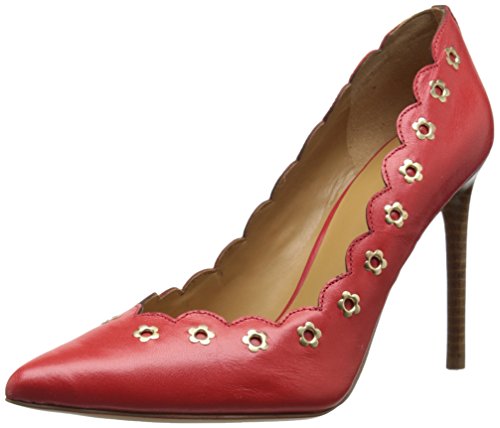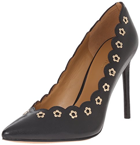 Pointed-toe dress pump featuring scalloped opening embellished with gold-tone flower studs