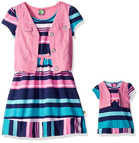 Short sleeve jersey striped dress with mock vest and matching doll garment