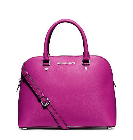 -. Brand : Michael Kors -. Color : FUSCHIA -. Department : womens -. EAN : 0889154029934 -. Feature : Fuchsia tone saffiano finished leather with polished silver tone hardware / Lined interior with zippered pocket, (4) open slip pockets and a key fob / Fully zippered top closure and flattened bottom panel / Dual rolled leather handles with a 4" drop, or use removable and adjustable strap / Measures approximately 12.5 inches (L) x 9 inches (H) x 4.75 inches (W) -. Model : 30S5SCPS3L -. ProductGroup : Shoes -. ProductTypeName : HANDBAG -. Size : 13" W x 8" H x 4" D -. Title : Michael Kors Cindy Large Saffiano Leather Satchel FUSCHIA -. UPC : 889154029934