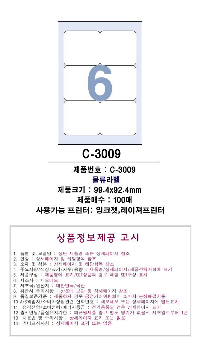 - 품명 및 모델명C-3009 물류라벨(6칸:2x3)(100매)