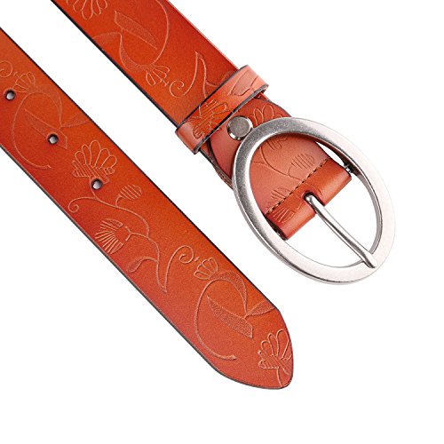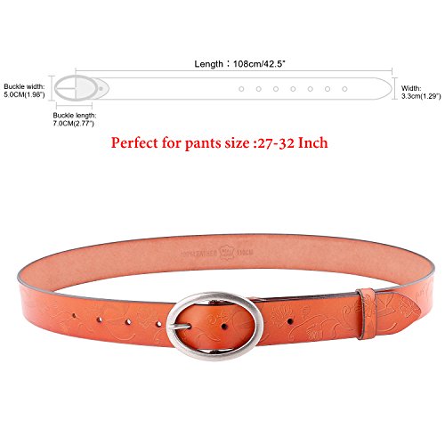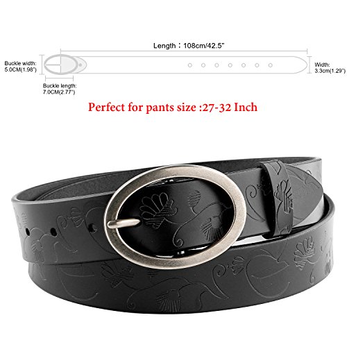 -. Feature : ✦ Suitable Size - From the buckle to the first hole and last hole 31.5" - 38.2", suit for women pant size 27"-32" (US size: 8-16). To get more accurate size, belts are all tried on by our male/female staffs, you can feel free to buy. Even you are thinner, this belt can be trimmed easily without any damage. / ✦ Good Material and High Adjustability - This vintage women belt is made of full grain material, genuine high-end cowhide leather with carved craft. The buckle can be easily removed and the strap can be easily trimmed to match your best waist size. / ✦ Retro and Vintage Design - This women jeans belt is in retro and elegant shape with very nice and comfortable wearing feeling, specially designed for ladies. / ✦ Fantastic Gift Box - This designer leather belt is enclosed in a sleek and modern gift box to get a quite good gift-giving experience. Great gift for girlfriend, wife, lover, mother, grandma and female colleagues as birthday gift or anniversary present. / ✦ Order with Grace - We guarantee the quality of our products, 100% satisfaction guaranteed, 45 days free exchange and returns plus 360 days warranty. Get refund easily and immediately.