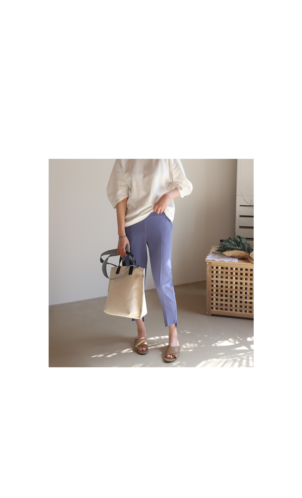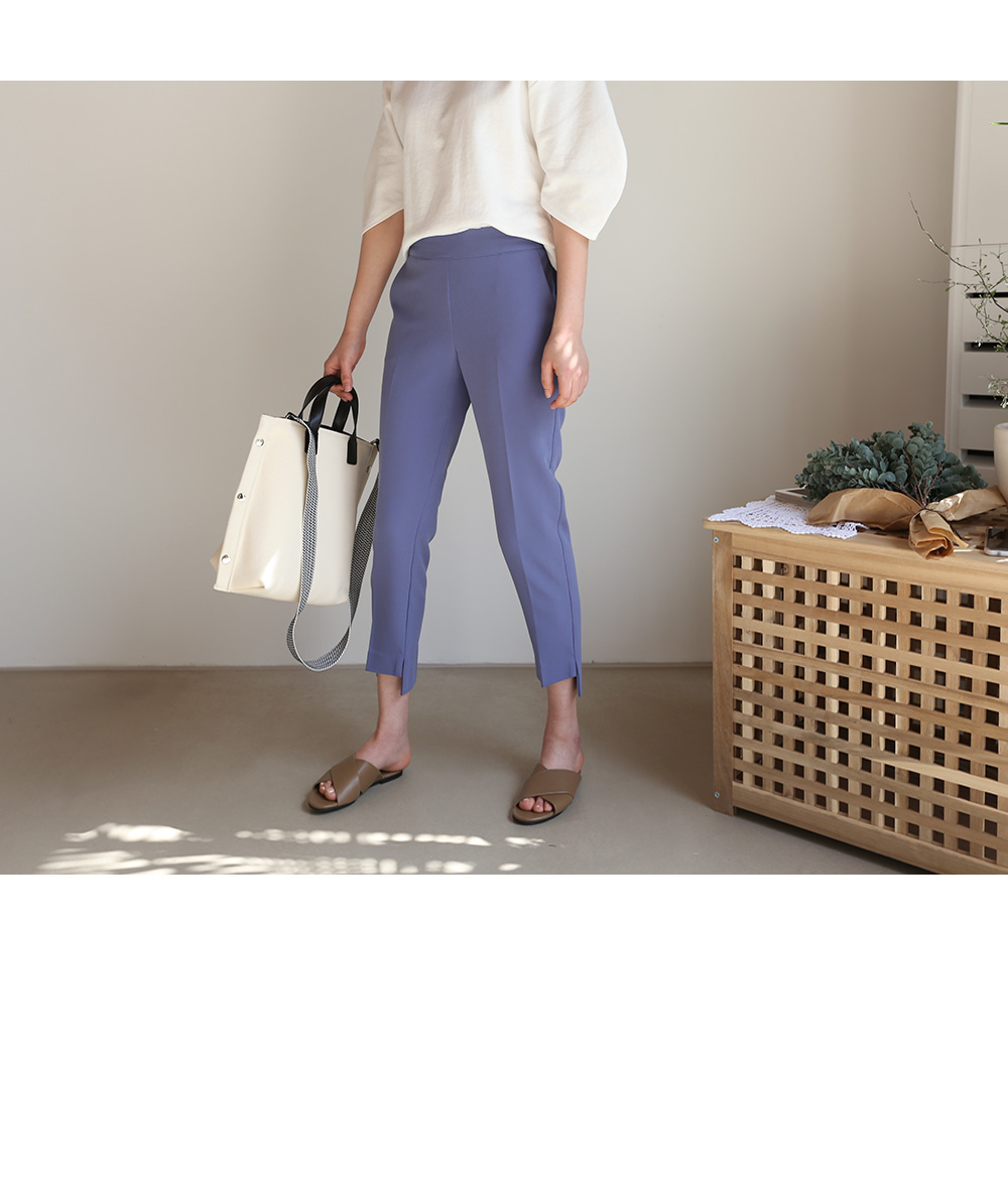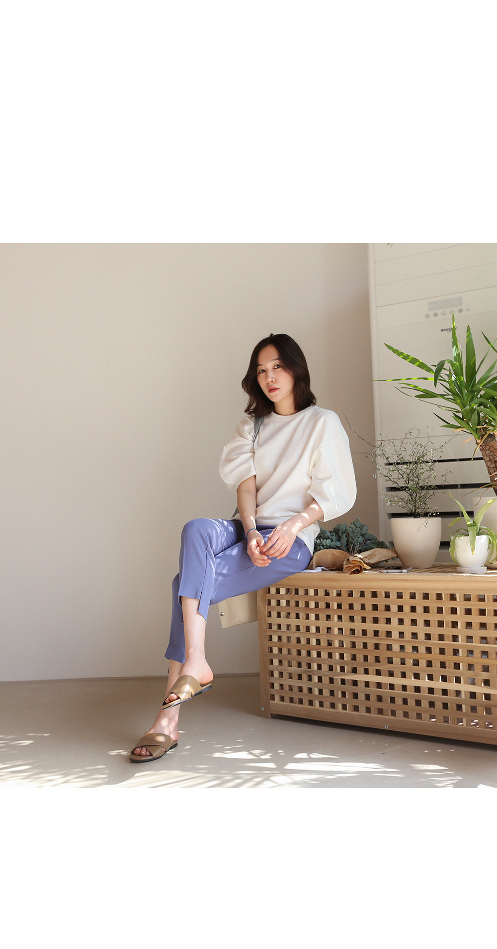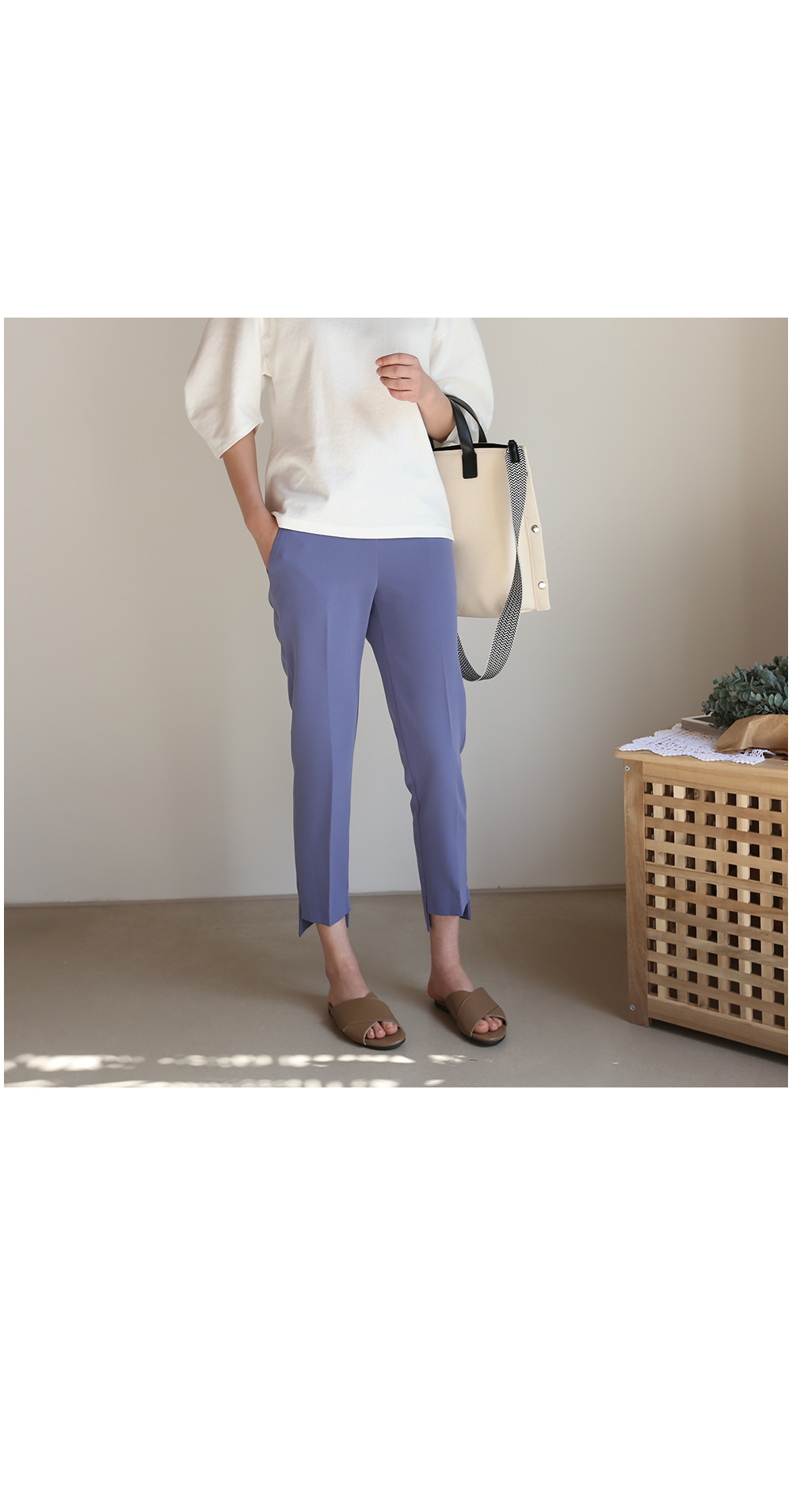 언발란스한 밑단 트임 역시 슬랙스 자체의 비주얼을 한껏 높여주며 러블리함과 동시에 역동적인 디자인으로 완성시켰습니다.