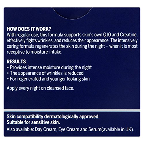 -. Binding : Health and Beauty -. Brand : Nivea -. EAN : 8851901090698 -. Feature : Please be aware that unless expressly indicated otherwise, Cooking Marvellous are not the the manufacturer of this product. Product packaging may vary from what is shown on this listing. We recommend that you do not rely solely on the information presented on our listing. Please always read the labels, warning and directions provided before using or consuming the product. -. IsAdultProduct : 0 -. IsAutographed : 0 -. IsMemorabilia : 0 -. Label : Grocery -. Manufacturer : Grocery -. Model : 81289 -. MPN : 81289 -. PackageQuantity : 1 -. PartNumber : 81289 -. ProductGroup : Beauty -. ProductTypeName : BEAUTY -. Publisher : Grocery -. Studio : Grocery -. Title : Nivea Visage Q10 Plus Creatine Anti Wrinkle Night Cream 1.7oz. / 50ml -. UPC : 890419258297