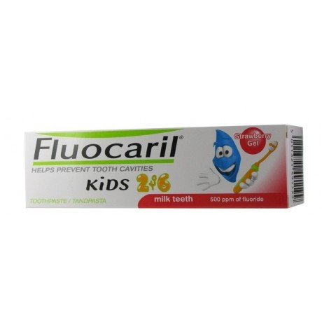 -. Feature : Fluocaril Kids Toothpaste 2-6 years-old is especially designed for children from 2 to 6 years-old. Its content of fluorine (500 ppm) supports the prevention of decays and it is compatible with the regular ingestion of fluorined tablets.The mild cleansing base respects the child's enamel and gums. It contains a fluorine derived.Strawberry taste.