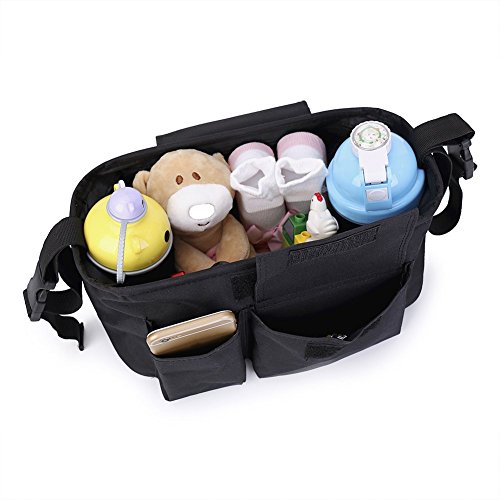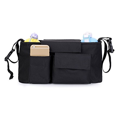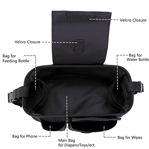 Features: 1.The Oxford fabric with premium quality is kind to the hands of the mothers and the health of the babies. 2.Total seven pocket designed: a middle compartment for diapers, snacks and toys. One hidden napkin for money bags. Two for bottle holders. Three outer pockets for wipes, keys, mobile phone. 3.This stroller organizer with adjustable magic buckle fits most prams. 4.This stroller organizer with the shoulder strap can be used as a shoulder bag or handbag.