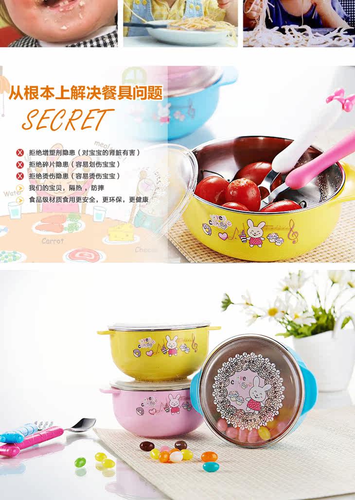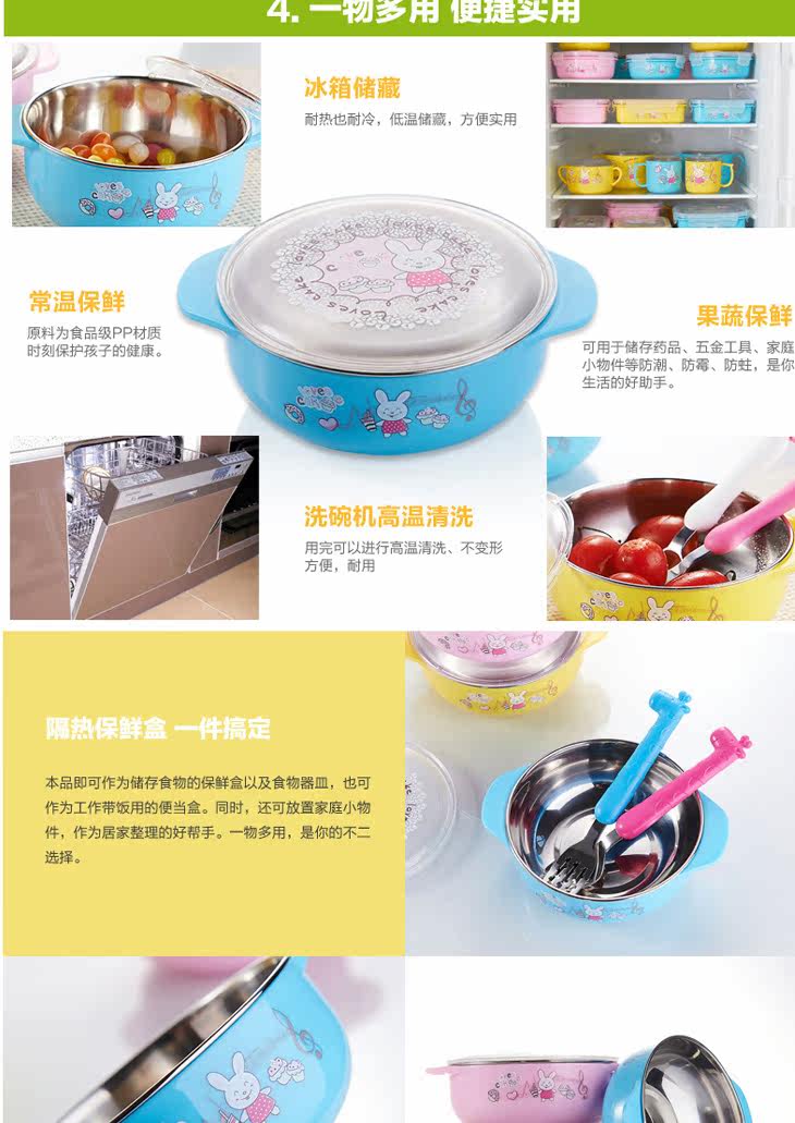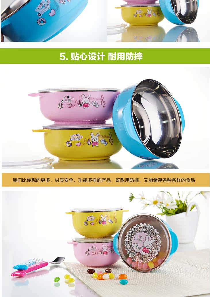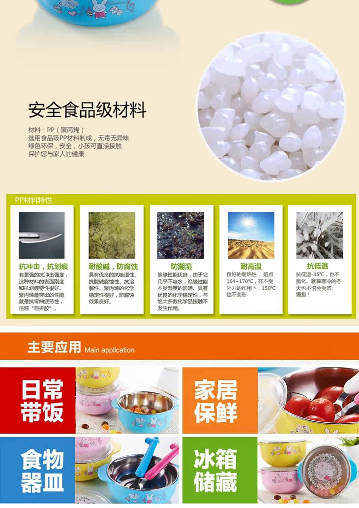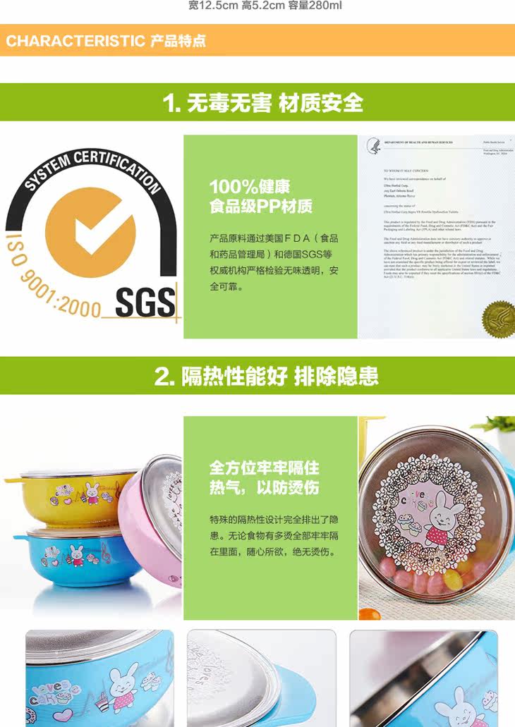 | Product Description | Round plastic food container (small), the product of raw materials by the US FDA (Food and Drug Administration) and the German SGS and other authority rigorous testing, tasteless, safe and reliable design special thermal insulation, heat comprehensive firmly separated live, anywhere , no burns. 304 stainless steel, as you lock the drain every drop of temperature, ultra-fresh advantage antibacterial function, food grade PP imports of raw materials, safe and reliable, excellent food and the outside world closed effect allow complete isolation, preservation of unique antibacterial function, nutrition and minimize the loss of water, binaural design, easy baby grip, bowl body lovely patterns, attract baby appetite more insulated with plastic, a get, a multi-purpose, it is your best choice. |