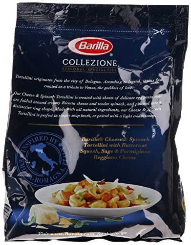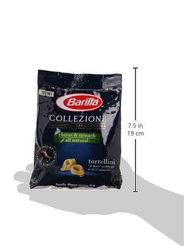 -. Binding : Grocery -. Brand : Barilla -. EAN : 0076808000238 -. Feature : Classic combo of spinach and ricotta cheese has long been a favorite filling for fresh pasta makers / Cooks in 10 minutes / Perfect size to feed the whole family / Pairs well with chicken broth, tomato sauce, melted butter or olive oil with parmesan cheese / Product of Italy -. Label : Barilla Pasta -. Manufacturer : Barilla Pasta -. Model : 1000003902 -. PackageQuantity : 1 -. ProductGroup : Pantry -. ProductTypeName : GROCERY -. Publisher : Barilla Pasta -. ReleaseDate : 2015-05-28 -. Studio : Barilla Pasta -. Title : Barilla Collezione Pasta, Cheese and Spinach Tortellini, 12 Ounce -. UPC : 076808000238