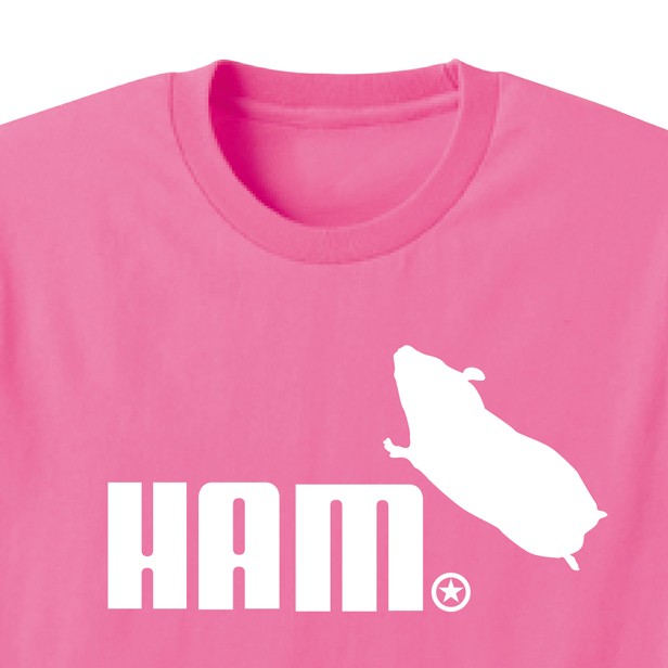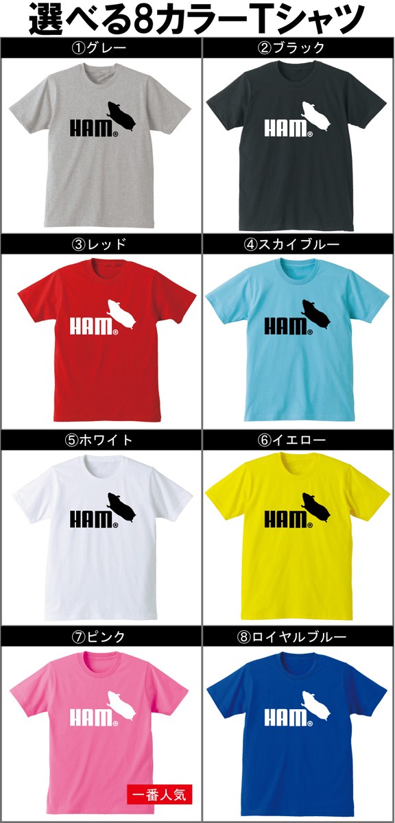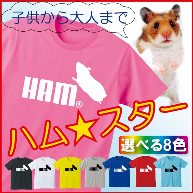 ハムスターをこよなく愛する方にお届けしたいtシャツです。ローマ字で「HAM」の後は○の中にCではなく、星(スター)のマークがデザインされています(笑)ようするに、HAM(ハム)星(スター)というわけです。!Tシャツのカラーは8色から選べるようになりました!サイズはキッズサイズから大人用までございます!親子ペアで着てたら最高にインパクトありますし、可愛いと思います。