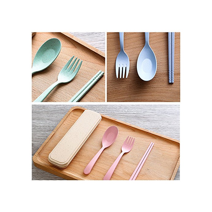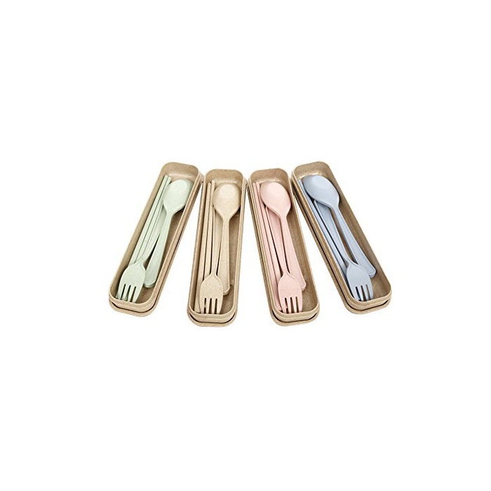 Tentock 콤비 세트 포터블 식기 스푼+포크+젓가락 3점 세트 밀짚제 식기 커트러리 세트 휴대 젓가락 세트 케이스 첨부 와 등산/피크닉/여행 식기 4 색선택 가능