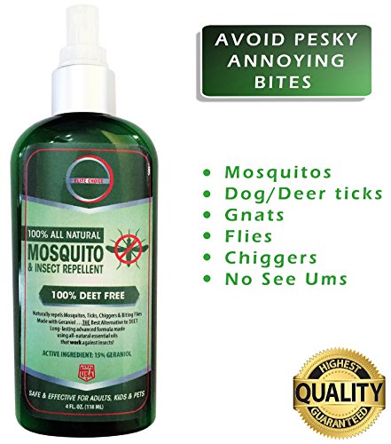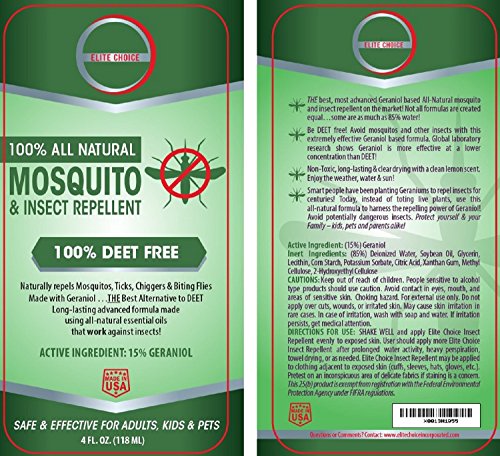 -. Brand : EliteChoice -. EAN : 0641361814396 -. Feature : COMES WITH FREE MOSQUITO GUIDE: Repels Mosquitos, ticks, gnats, flies, chiggers and No See Ums / PERFECT 4 oz TRAVEL SIZE: For vacations, camping, fishing, hiking and outdoor recreation / ELITE CHOICE GUARENTEE: 100% money back guarantee. Use code ECREPELS to get 10% off / ENJOY THE SUMMER: Keep your family protected at the park, beach, grilling/BBQ, or by the pool. / CLEAN, RELIABLE & NON TOXIC: Advanced formula has been tested to give you the protection needed -. Label : Elite Choice Inc. -. Manufacturer : Elite Choice Inc. -. PackageQuantity : 1 -. ProductGroup : Lawn & Patio -. ProductTypeName : OUTDOOR_LIVING -. Publisher : Elite Choice Inc. -. Size : 4oz -. Studio : Elite Choice Inc. -. Title : Best Natural Mosquito Repellent Spray - 100% DEET FREE - Travel Insect Repellent Repels Mosquitoes, Ticks and Biting Flies. All Natural Bug Spray is Safe for Your Kids, Pregnant Women and Pets -. UPC : 641361814396 -. Warranty : 60 day Money Back Guarantee